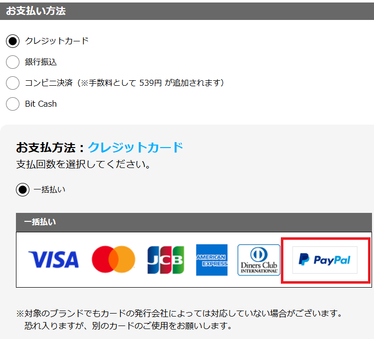 クレジットカードブランド欄に「ペイパル」のロゴがあることを確認してください。