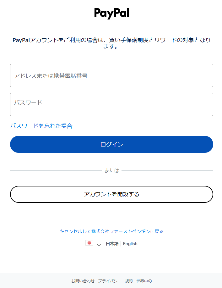 ※ペイパルアカウントを新規登録する場合、次の画面で電話番号認証作業が発生いたします。