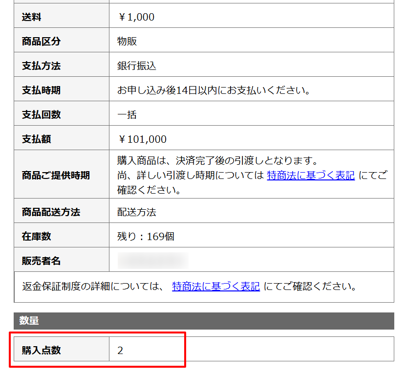 商品数は1点から販売者が商品毎に設定している最大お申込み数までとなります。
